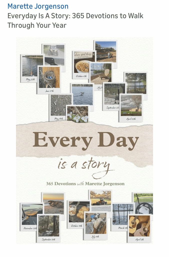 This yearly devotion book came about after a friend challenged Marette to write a devotion for each day of the year. Anticipating surgery in the latter part of the year, Marette spent the first six months writing the devotions. In July, she then sent off a month to 12 friends, to read through and give her feedback. By September, the months’ devotions came trickling back. After shoulder replacement surgery, with lots of time on her hands to sit and recover, Marette went through each month, giving heed to the friend’s suggestions and putting the book together as a whole. A bit puzzled over what to name the book, her daughter-in-law, Bri, a graphic designer who would create the cover design, suggested “Every Day is a Story.”