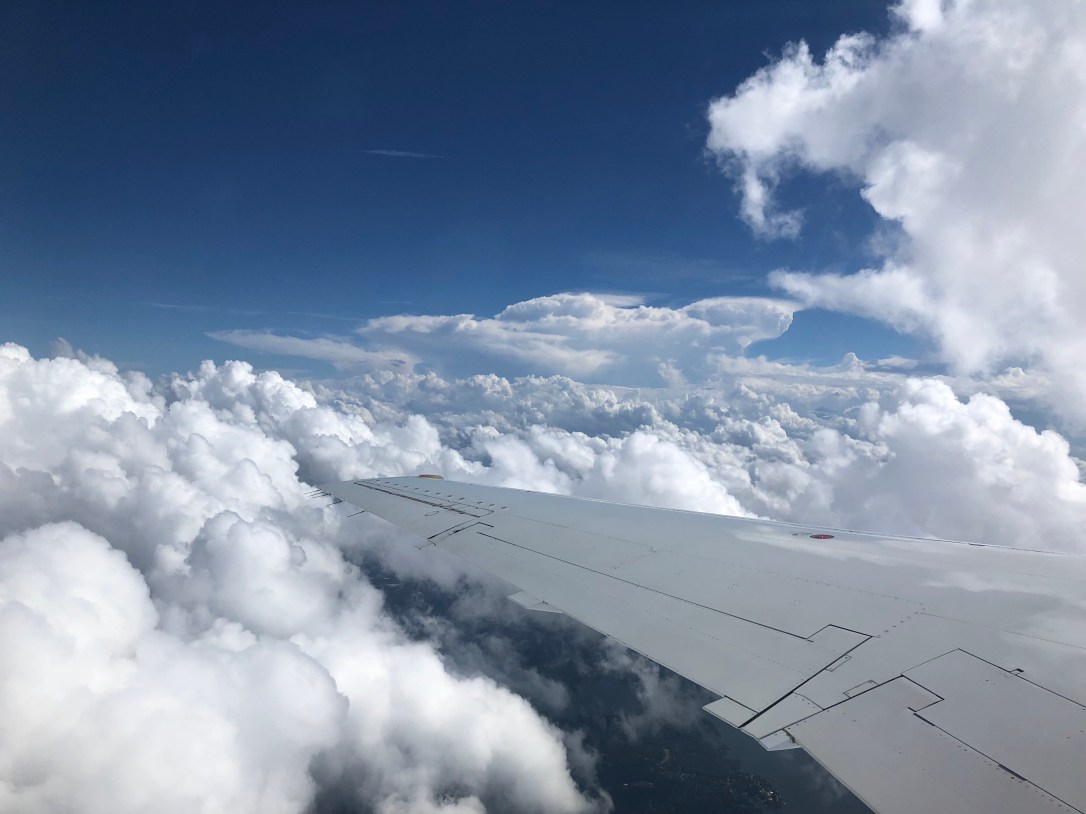 The beauty of flying is right outside the window. I marvel that one can get in a can, so to speak that’s what an airplane is, and get off hours away in one piece, still breathing and hug loved ones. That amazes me. The beauty is watching the world go by. There have been times when I could see the ground and follow where we were flying down to knowing that towns we were passing over. There have been times at sunrise or sunset that I marvel at the intense beauty that I can’t explain, in a tin can I can’t figure out and marvel all this to a God I don’t see but feel his presence. Those are a lot of intangible things in one sentence but so very real. Then there are clouds. Yesterday we rode in clouds most of the way. What is a cloud? It is a visible mass of condensed water vapor floating in the air. Yup- that’s Webster definition. Mine would be more like, whitish, cleanish, floaty stuff that resembles cotton balls but are transparent and when you are looking at them they look so cool and when you are flying through them you just go “ahhh”.