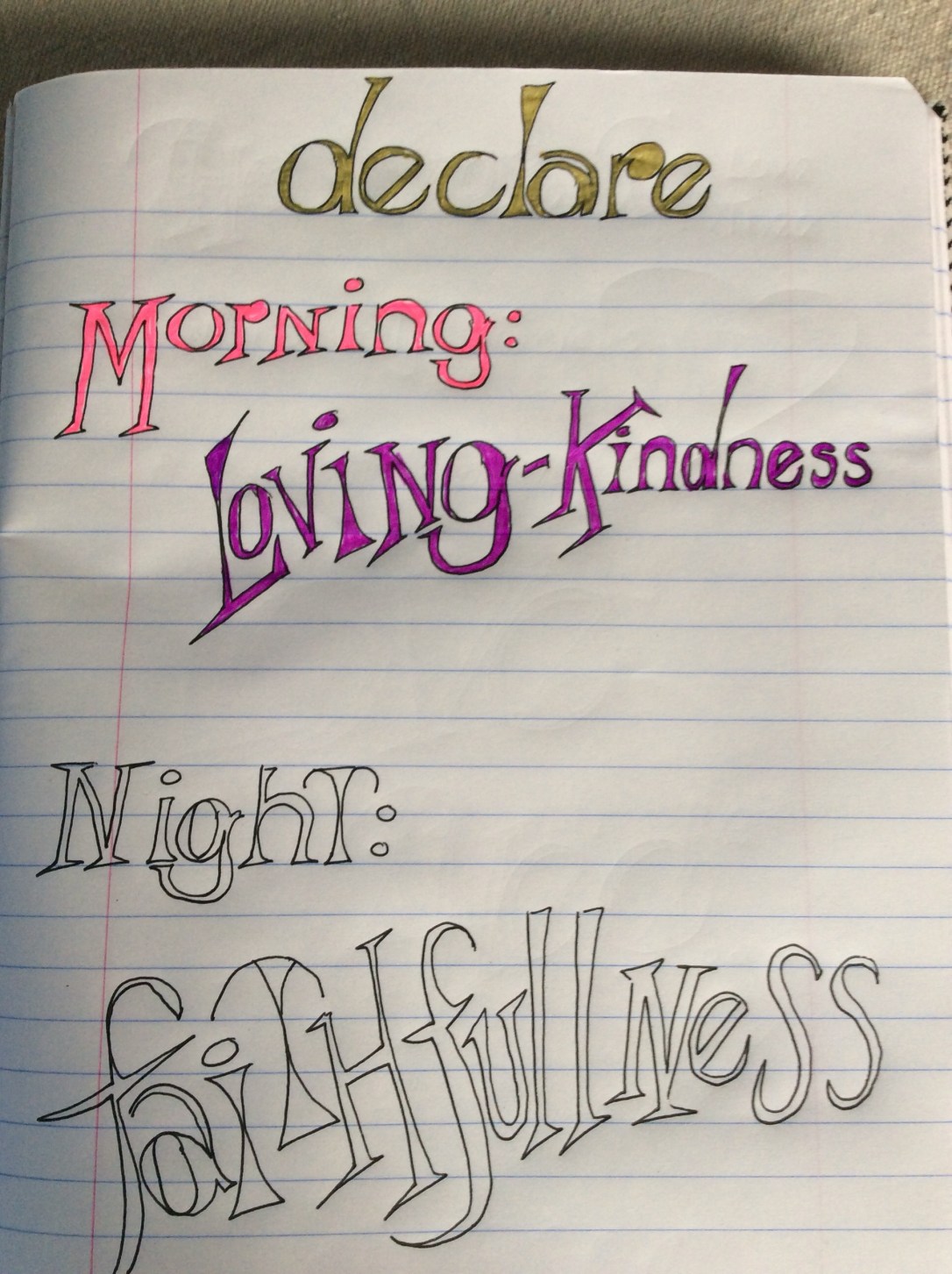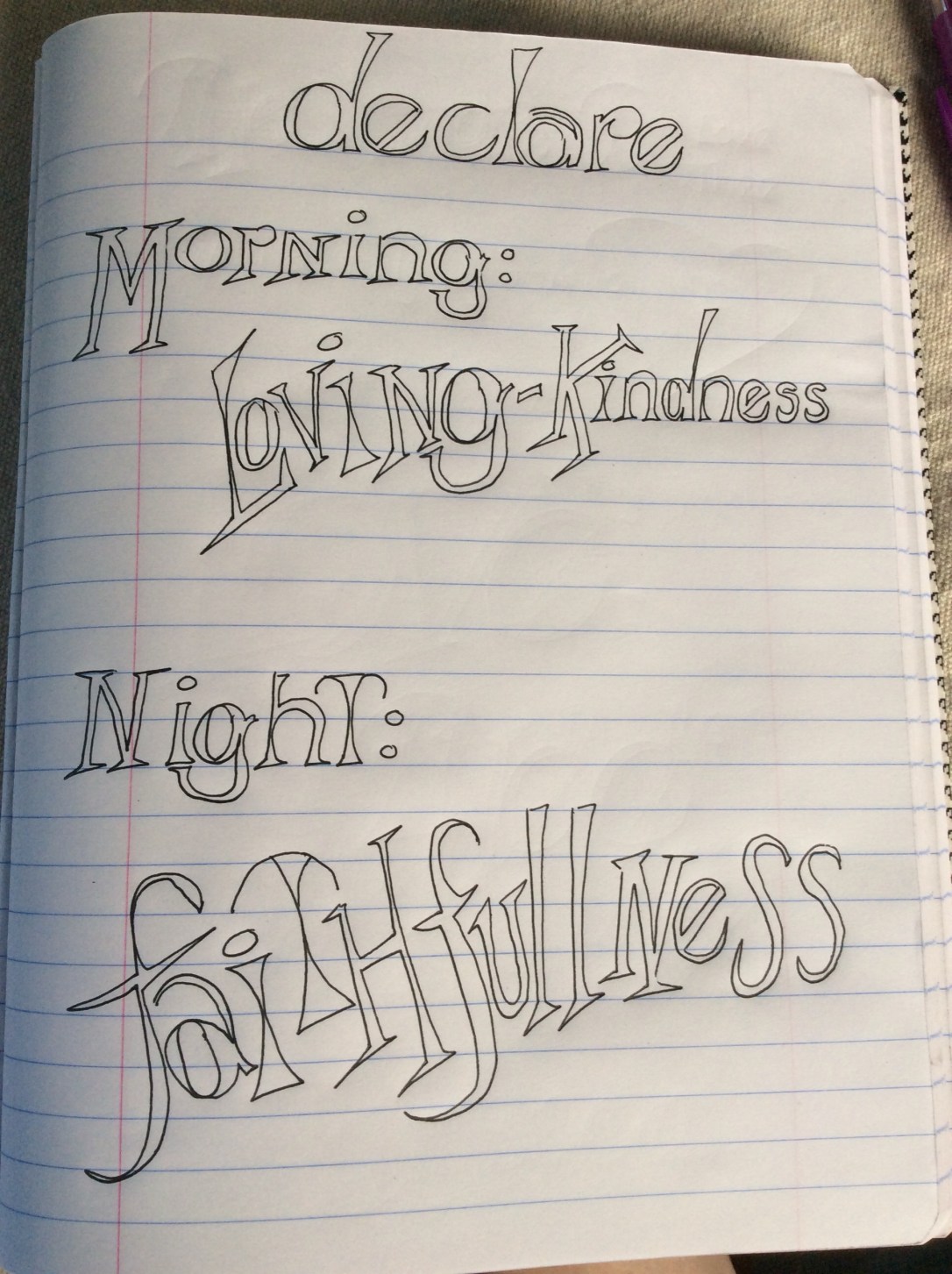 Do we declare the loving kindness of God in overkill mode like our radio and television stations do the bad news? I sat down this morning to watch the haze on the fields and the sun slowly come up Psalm 92 was on my heart. So, I drew it. Rather boring that first attempt at the letters. Basic, uneventful, simple and boring if I may say so. And yet, God is far from boring in our lives, we just perceive it that way. Our anticipation of what God will do in our life this day: we have no clue, and then, he starts to color. Isn’t it amazing how just a bit of color changes the page? I did not think about the man who opened the door for me yesterday as loving kindness. I sometimes overlook the phone call, the pat on the back, the simple things someone does as loving kindness from God. Yet, all those things color my life with his loving kindness. I sat at lunch with two dear friends talking about what God is doing in our lives. I stood hand in hand with a friend and a total stranger praying: her life overcome with grief with the death of her husband a year ago and picking up the pieces of her life seemingly a burden almost unbearable. I listened to a young girl give her demonstration and my heart had all these other things come to mind of the past, of fun moments when I was her age, of the thrill of a blue ribbon, of the anticipation and nerves and I said to myself, God is so faithful and I am not even looking.