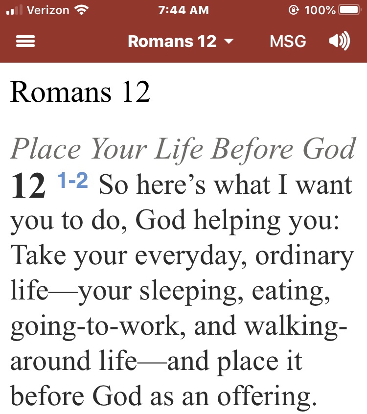 Paul gives us a list of what God would like us to do and then gives us that line that changes it all; God helping you. It seems so simple the way it is stated. Take your everyday life and live it with Jesus being your hands and heart! The stuff you do normally, make it be an offering to God that makes him smile and people relax. Then he adds specifics like your sleeping, your eating, going to work and walking around life. That about sums its up. That’s pretty much a normal day. We sleep, we eat, we work and we walk around trying to figure out what we were doing so we can finish it. I am sitting in the new to me green comfy chair in the corner. I see an envelope that is ready to be shipped, a puzzle that needs finishing, prayer list great needs to be gone through, and menus that need to be planned for the week. I see my journal which tells me what I have planned for the week and I see it’s all “walking around life” stuff. Sometimes I don’t think of it as a living sacrifice. Sometimes I don’t see it as anything good just stuff I have to do. And yet there is so much fun in the walking around life. I sat at a hockey game yesterday, picked up a new to meet huge Christmas tree for next year, painted, made cookies, did dishes, played with a dog and watched a couple very good football games. I was Just walking around life. Step by step I am being Jesus with skin to those I meet. Isn’t hard, it isn’t easy: but it’s what I am supposed to be doing to lay an offering at the feet of Jesus. The kicker is the statement, ” God helping you.” So off I go to be more that what I could normally be cuz I have that statement at the end of the directions. It’s beyond Mix well. It’s better than stir for 10 minutes and kneed gently. It takes the work off my heart and puts it on Gods shoulders. I can handle that!