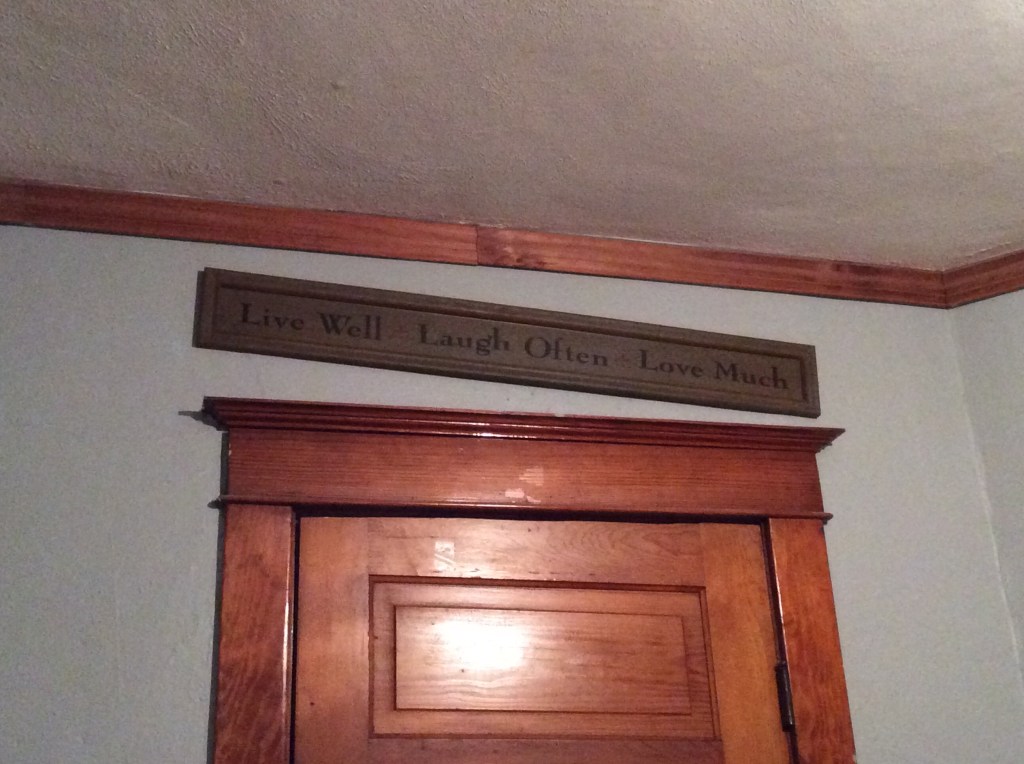 I couldn’t sleep. That’s not abnormal for me especially since the person I married has become a tuba player. No, he hasn’t taken up music, just the competition called snoring. And he wins. I go into the guest room. Tonight, very moved by two Good Friday services, I couldn’t sleep. So, I to the guest room I went and began to think. Then I looked up. It’s a beautiful plaque. Simply says, live well, laugh often, love much, and it’s crooked.